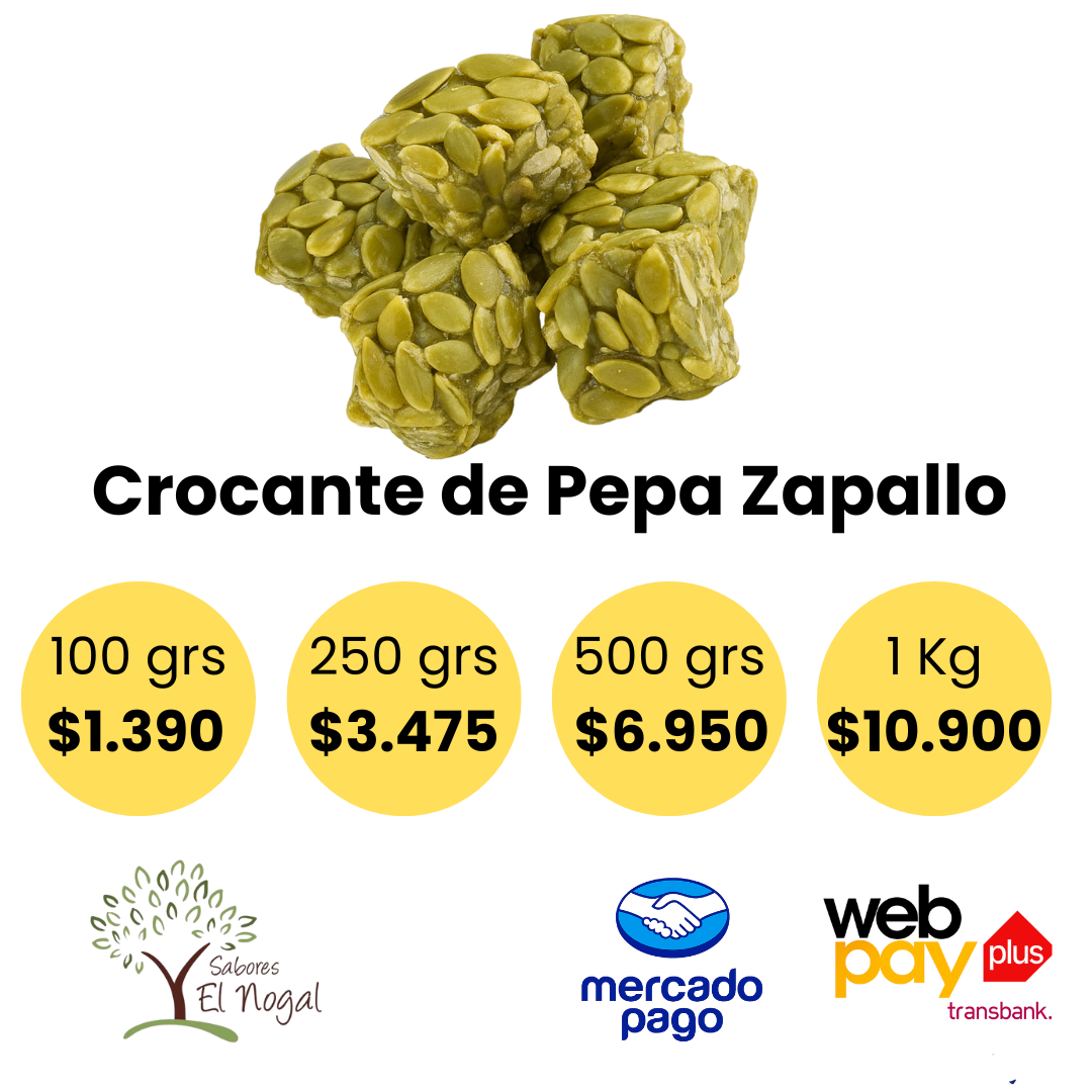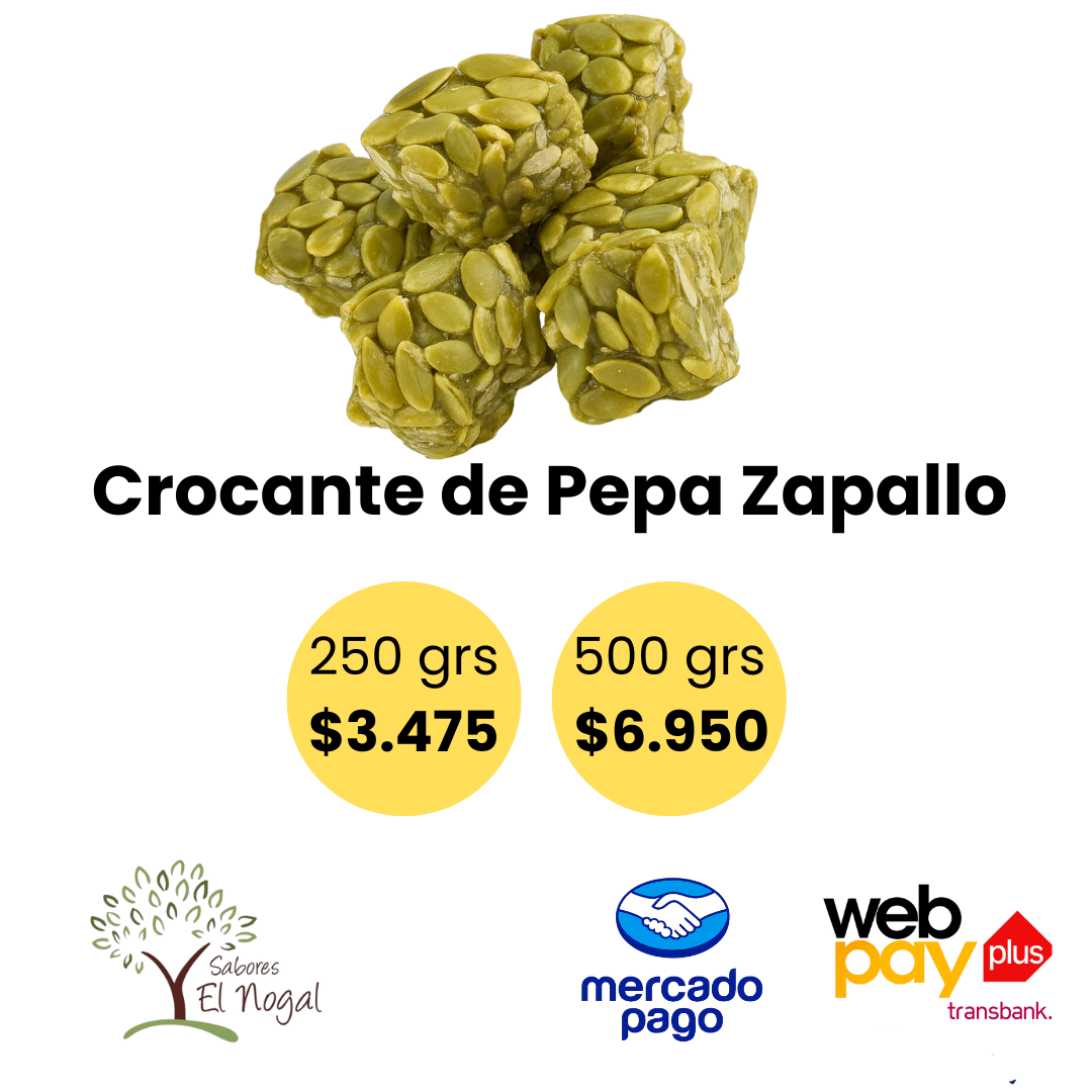 El crocante de zapallo es un snack tradicional, elaborado con semillas de zapallo y caramelo, que entrega un sabor dulce y un toque crujiente único. Es fuente de fibra, antioxidantes y grasas saludables.
