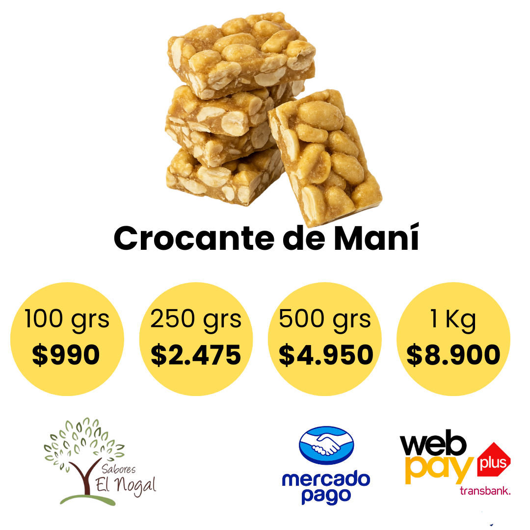 El crocante de maní es un snack tradicional que combina el sabor tostado del maní con el dulzor del caramelo. Es fuente de energía, proteínas vegetales y grasas saludables, ideal para disfrutar en cualquier momento.