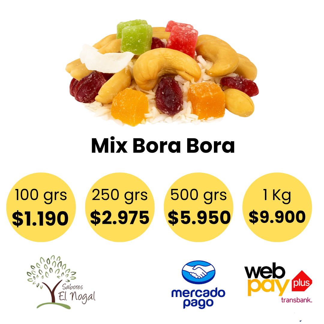 El Mix Bora Bora es una mezcla tropical y equilibrada que combina coco laminado, cranberry, frutas deshidratadas, castañas de cajú y maní salado con miel. Esta combinación ofrece un contraste delicioso entre lo dulce, salado y ácido, además de ser una fuente natural de energía, antioxidantes, grasas saludables y fibra. Ideal para quienes buscan un snack sabroso y nutritivo con un toque exótico.