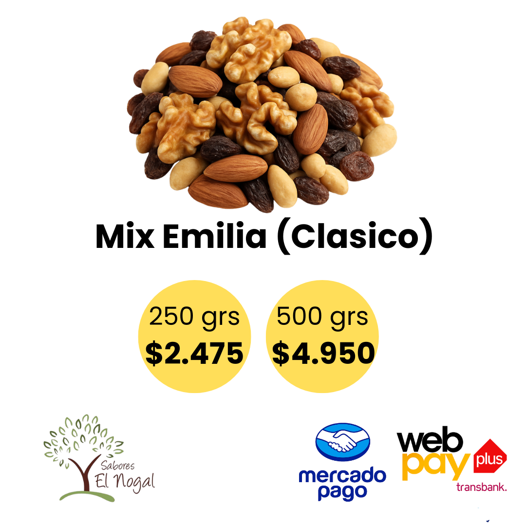 El Mix Emilia Clásico combina lo mejor de los frutos secos: maní, pasas, nueces y almendras. Una mezcla equilibrada que entrega energía natural, rica en grasas saludables, antioxidantes, fibra y proteínas. Ideal para mantenerte activo y apoyar una alimentación saludable.